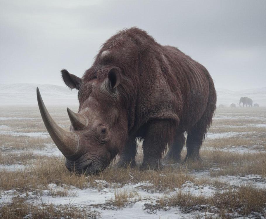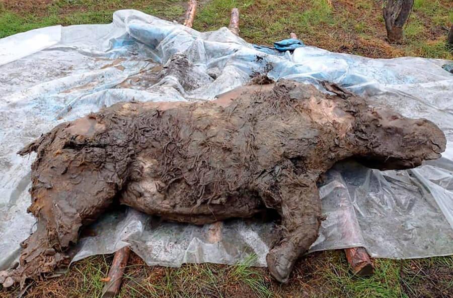 Вълнестите носорози (Coelodonta antiquitatis) През август 2020 г., когато вечната замръзнала почва на североизточен Сибир започна да се топи, местният жител Алексей Савин направи откритие, което палеонтолозите описват като "фантастична находка". По бреговете на река Тирехтях в Абийски район на Якутия, той открива почти перфектно запазен вълнест носорог, замръзнал във времето. Първоначално оценен на 20 000-50 000 години, носорогът е бил по-късно датиран прецизно чрез радиокарбонен анализ на около 32 400 години. Около 80% от тялото на младото животно все още е било непокътнато - невероятно постижение за организъм, който е живял по време на последната ледена епоха. Научната стойност на това откритие е изключителна. За разлика от костните останки, меките тъкани предоставят директен достъп до ДНК и позволяват изследване на козината, физиологията и начина на живот на вида по начини, които са невъзможни при откриване на останки само от скелети. Изследванията показаха, че носорогът е бил на 3-4 години, когато е загинал - все още младо животно, което не е достигнало полова зрялост. Височината му до рамото достига около 130 сантиметра, приблизително метър по-малка от възрастно животно. Тъмните петна по рога показват, че животното е използвало израстъка си за събиране на храна - вероятно за изгребване на снега, за да достигне до нежната растителност под него. Това потвърждава теориите на учените за поведението на вида. Едно от най-интригуващите открития е състоянието на самата мумия. Докато дясната страна на носорога е отлично запазена с кожа и козина все още непокътнати след хилядолетията, лявата страна показва драматична разлика. Тя е силно повредена - от горната част на бедрото до нивото на лопатката тялото е тежко разрушено, с открита вътрешна кухина и липсващи повечето черва. Палеонтолозите са открили ясни признаци, че животното е било нападнато и изядено, или малко преди смъртта си, или веднага след това. Учените смятат, че младият носорог вероятно се е удавил - възможно е да е бил прогонен от хищници към река или блато, където е загинал. Находката от река Тирехтях не е първата от този район. През 2014 г., само на няколко километра разстояние, е била открита женски млад екземпляр вълнест носорог, която учените нарекоха "Саша". Тя е била на около 10 000 години и е покрита с фина, почти руса козина. Сравнението между двете находки е особено интересно. Новооткритият "Абийски носорог" (наречен така по района) е с по-тъмна козина и е на по-напреднала възраст от Саша. Това дава на учените уникална възможност да проследят как се е развивал видът през различните етапи от живота си - нещо, което не е било възможно преди тези открития. Едно от най-неочакваните открития при Абийския носорог е 13-сантиметровата гърбица, пълна с мастна маса, на гърба му. За първи път учените виждат подобни характеристики при вълнестите носорози. Мастните гърбици обаче са относително често срещани при арктическите животни. Те са еволюционна адаптация, която помага на животните да преживеят екстремния студ и да съхраняват енергия през периодите, когато храната е оскъдна. Това откритие показва колко добре приспособени са били вълнестите носорози към суровия климат. Вечната замръзнала почва на Сибир създава идеални условия за мумифициране. За да се запази животно по този начин, то трябва да умре в район с веч