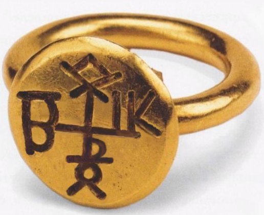 Въпросното изображение не е фалшиво, а хипотетично - изненадан съм, че не си разбрал. В темата тук представям моя хипотеза, базирана на някои от изводите на Йоахим Вернер, а именно, че монограмът на един от пръстените означава "XOBPATOY" или "XOYBPATOY", а също и че "ПК" означава "ПАТPIKIOY" - на тази база лансирам хипотезата, че на един от пръстените-печати имаме " XOYBAPOY ПАТPIKIOY ", а на другият - " ABITOXOPOY ПАТPIKIOY ", сиреч това са два патрициански пръстена на някакви роднини на Кубрат - Хувар(Хувер->Кубер?) и Авитохор (Авитохол?), докато на неговия пръстен няма титла "патриций", оттук правя предположение, че би трябвало да има и пръстен с монограм " XOYBPATOY ПАТPIKIOY " и съответно направих компютърен модел на този хипотетичен пръстен, който може би лежи още неоткрит някъде в околностите на Малая Перешчепина, но може да е останал скрит у някой от селяните, които са плячкосвали артефактите през 1912, впоследствие я претопен, я загубен или продаден.