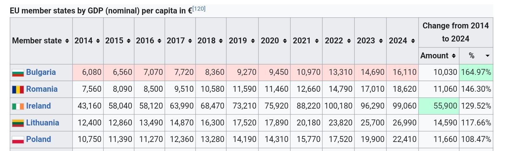 Едно от малкото положителни и важни неща за което сме първи в ЕС - ръст на брутния вътрешен продукт на глава от населението за периода 2014-2024 г. - 164,97%!