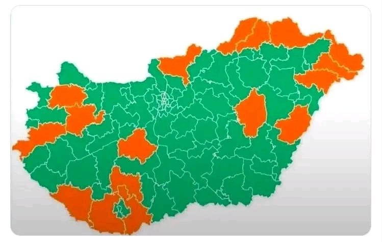 Електоралните нагласи в Унгария преди изборите. В оранжево за Орбан и партията му, в зелено за опозиционната Тиса.