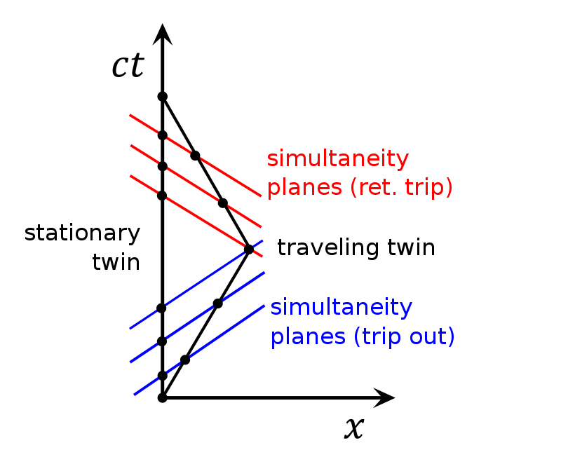 Когато останеш без доказателства... това са думите Забравих, че не го казах както ти искаш... Скока във възраста на земния, при обръщането на пътуващия. Идеята е, че щом имаш момент от пристигане на сигнал от събитие, значи задължително имаш и момент от старта на този сигнал. Който момент съвпада с моментът на случване на това събитие. А картинката казва, че липсва момент на случване на това събитие. Това е противоречието
