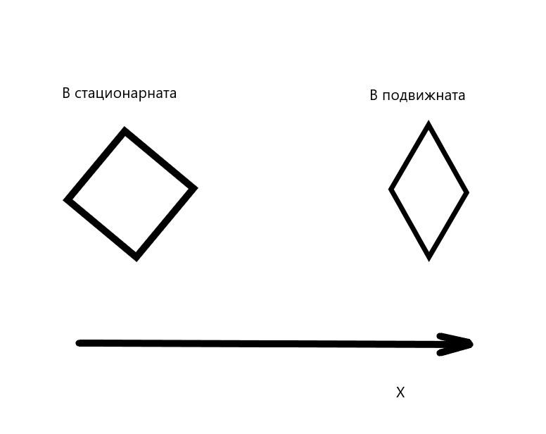 Добре, нека така да го кажем. Сега убеди ли се, че при ЛТ може да се завърти пръта. Сега ми кажи коя страна от ромба остана успоредна на оригиналната си? Нито една. Представи си, че страните на квадрата/ромб са пръти. Всички пръти се завъртяха. Е? Може или не може ЛТ да завърта пръти в зависимост от това в какво направление е движението спрямо пръта Сега си представи два пръта, успоредни един на друг, но относително подвижни по направление на дължините си. Един спрямо друг, те винаги ще са успоредни, нищо че един друг ще се виждат скъсени Следва продължение. До тук ясно ли е всичко?