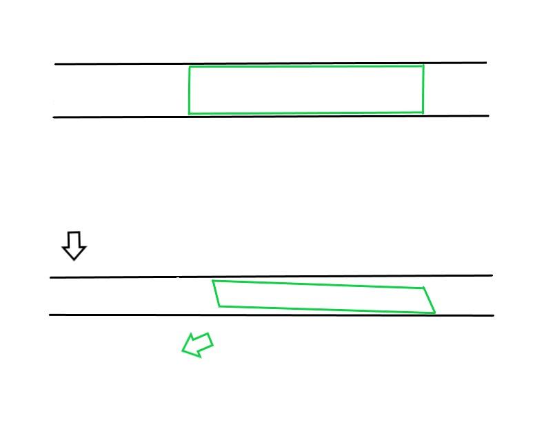 Ако лявата част отразява ОС на Наблюдателя, е добре, но синия правоъгълник (влака) не остава правоъгълник. Трябва да изглежда ето така: ...защото Лоренцовото скъсяване е по посока на относителното движение. Относителното движение м/у Н-Влак и Н-релси не е едно и също, нищо че влака се движи по релсите. А ти си показал еднакво скъсяване Дясната част на картинката не се разбира за коя ОС е, но при всички случаи Наблюдателя се скъсява по друг начин. За ОС на релсите, скъсяването на Н трябва да го завъртиш на 90 градуса