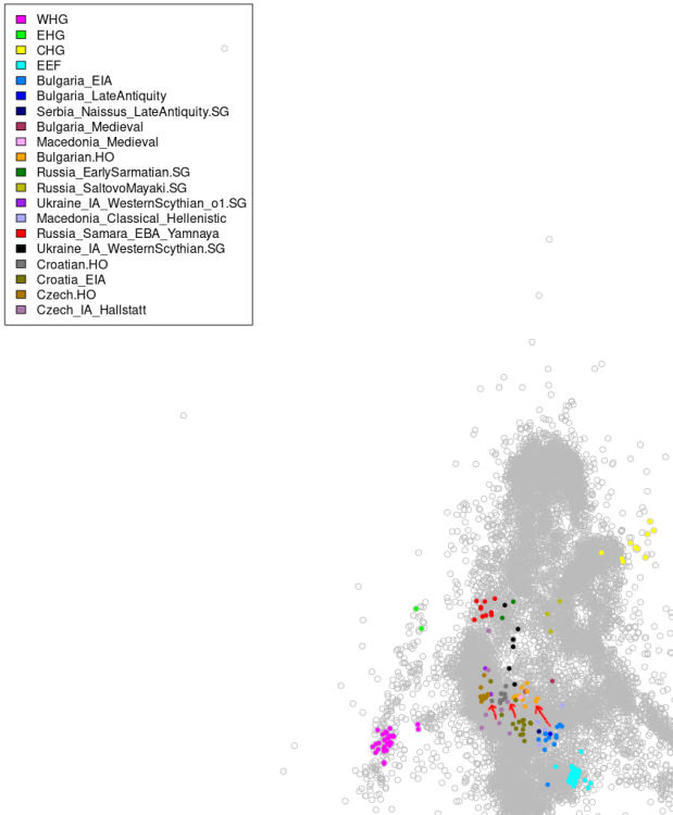 По-горе е споделена база плод на две седмици труд за да изкарам от ENA пробата от Стамболово. За да имам втора проба освен тази от Джулюница. Резултатите бяха същите. Сега с новата версия на базата Стамболово е EIA не е IA. Така че, въпреки препотвърждаване не е коректно използването им така. И добре, че съм се забавил. После не игнорирам yDNA и mtDNA. Такъв труд вече е публикуван. Горе е споделен. Изводът е среден Днепър. Изследването на Нешева-Карачанак също използва методи за сравнение на базата на mtDNA. Изводът им е 40% местни 60% други от западна Евразия. Какво игнорирам? Вкара конспирация, че нарочно целия свят не ти намира "пра-българи". Сега ме занимаваш с някаква проба. Ми плотни си я на PCA. Намери сходни с нея от същия период и локация. Опитай се да си тестваш някаква хипотеза дали е статистически значима спрямо образуването на модерната и средновековната ни популации. Само не ме обвинявай, че целенасочено не съм ползвал някаква проба. Тези популации са изтествани. Не са значими! Конспирациите си ги ..... в ... Turkey_Archaic_SubGeometric Turkey_Byzantine Turkey_Byzantine_oAfrica Turkey_EarlyByzantine_1 Turkey_EarlyByzantine_2 Turkey_Hellenistic Turkey_IA Turkey_IA_o6 Turkey_Ottoman Turkey_Ottoman_ArabGraves Turkey_Roman_1 Turkey_SoutheastByzantine Turkey_WestByzantine Резултатите не противоречат на нито едно изследване до сега свързано или не с темата. Освен пръднята за усуните. Кво ме занимаваш с това, че ви се спихна глупостта, че няма субстрат. Аз ли съм ви виновен?