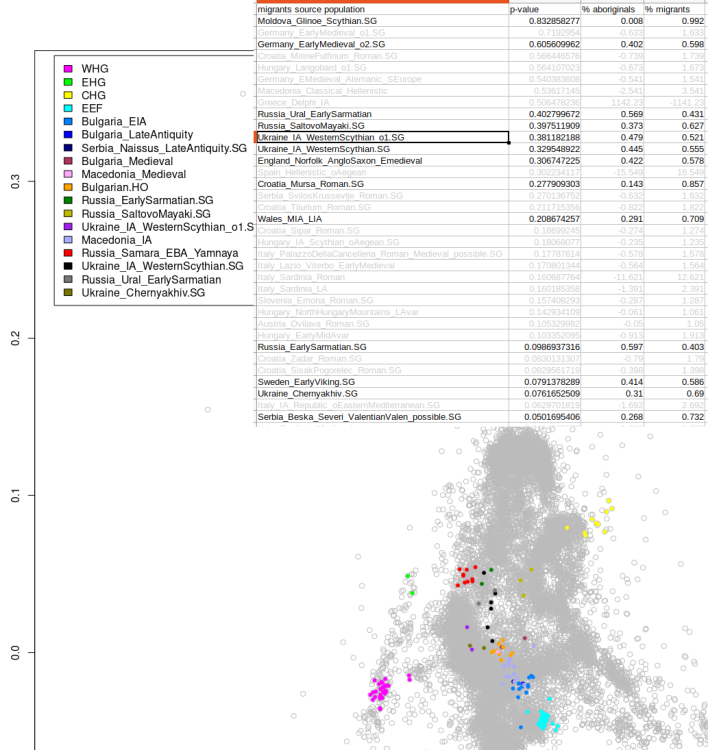 Мани желанията и надеждите напрвих същото пак всички 327 популации от 1000 BC до 1800 AD обаче за хърватите. Croatian.HO = Croatia_EIA + x(всяка от същите 327) Всъщност 326 без Croatia_EIA. И резултата направо не искам да го тълкувам. Защото в статията за черняховците те са готи. Остава най-близки до славяните от които нямаме проби да са баш те. Което не е ОК. Но поне разликата между нас и хърватите е че при нас излизаха и сармати. А при тях не. Което си е нещо. Може да се работи по наш трикомпонентен admix. Което е още работа да го ....