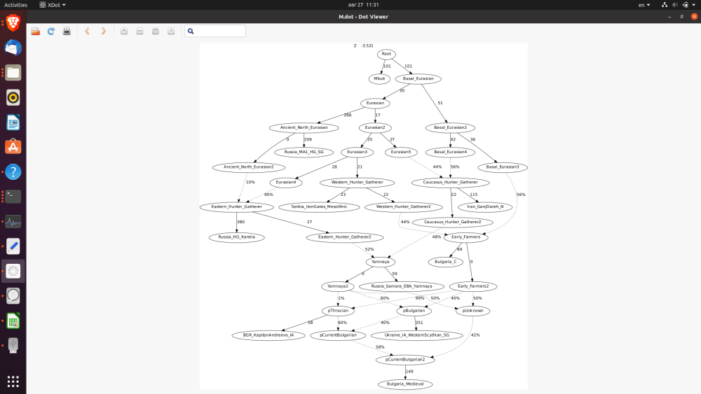 Не трябва да се ползват данните без да се разбира статията, Словенците не са хахави. Предполагат микса да е станал по среден Дунав и така не им се налага да спорят с историците за славянски изсипвания, морета потопи и подобни. За разлика от Гърците не предполагат приемственост. Всички ходят на пръсти, защото има векове миграционнен наратив. Просто няма да са от полза ако се конфронтират с всичко до сега. Та си е буквално ходене по въже. Едвам се долавят на юг от Дунав набедените за славяни от Полша до Москва. Но Курта игнорира цялата археогенетика за да може славяните да са с корен не на Днепър а на долен Дунав. Та ще стане сложно хем изворите с фокус при долен Дунав и археогенетиката с фокус на Днепър и на среден Дунав да са прави, за да запази наратива за източни и западни, пък южните микс и миграция. Например Усуните дават много добра оценка за Унгарците не само с добро Z ами и с добро p. И съвпадат напълно с каквото знаем за Лазигите. Там изворите и археогенетиката се допълват а езика според Унгарските лингвисти си е там преди PIE. Най много WHG ~50% има пък при Фините. А Унгарците имат подобен на нас микс Hungary_LateC_Baden(фермери) + Russia_Samara_EBA_Yamnaya(PIE) с много добро Z и невъзможно малко p. Така че какъв ще е езика не зависи от гените това са две комплексни системи, които си влияят, но няма аналитичен закон по който си влияят. Най-вероятно защото са системи от реалния свят. Тоест не само комплексни а напълно стохастични. И в крайна сметка и информационната система(мрежа на езиците) и информационната система(мрежа на мутациите) са просто под системи на една доста по-голяма невъзможна за разбиране(описване) информационна система, ние хората. ROLLOFF за този микс дава 59.827114(генерации) * 28 = 1,675(години). Така хем Лазигите идват от Азия, хем спират на среден Дунав.