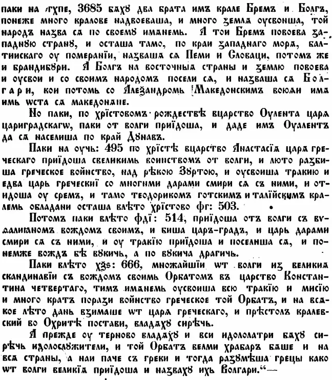 Bulghar е при волжките българи на Котраг, другите споменати до Рим са дунавските. Беленджар, е столицата на Батбаяновите, бурджан-българи. Затова и объркването. Някои автори се циитират едни други. Долу също споменават печенеги-тюрки, граничащи с гърци. Става въпрос по скоро за гръците в Крим, защото накрая споменава българите граничещи с ИРИ. Арабите са оставили много безценни свидетелства за степните народи, в това число и българите. За превода и интерпретацията на текста нищо не мога да кажа, но ако погледнеш думите в именника на бъл. владетели изглежа човекът е имал право относно езика. The Bashkirs are of two kinds. The one is at the extremity of the Chuzz country behind Bulghar. It is said that their total numbers amount to about 2,000 men, in a strong position among woods where none can reach them. They obey the Bulgars. The other Bashkirs border on the Pechenegs, i.e., the Turkish Pechenegs bordering on the Greeks. The language of the Bulgars is like that of the Khazars. The Burtas have a different language. Similarly, the language of the Russians is unlike those of the Khazars and the Burtas. ‘Bulghar is the name of a city. The people are Muslims, and in it is a cathedral mosque. ‘The Russians ar of three kinds. The king of those nearest to Bulghar lives in a city called Kuyabah [Kiev]. It is larger than Bulghar. Another kind, farther off than these, is called §lawiyah [Slavs], and there is a kind called Arthaniyah, whose king lives in Artha. Their dress is the short coat. The dress of the Khazars, Bulgars, and Pechenegs is the full coat. These Russians trade as far as Khazaria, the Greek empire and Great Bulgaria, which borders the Greek empire on the north. The last are very numerous. Their strength is so great that they have levied a tribute on the neighboring Greeks. The people of Inner Bulgaria are Christians.” T