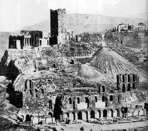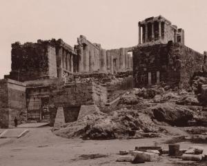 Добре казано. Е, да видим как се е състезавал Партенонът. „Антични” и „варварски” археологически паметници в Гърция Гръцкото въстание и създаването на новото Гръцко кралство в началото на ХІХ век предизвикват силен подем на „елинофилията”, култивирана в продължение на няколко века от школата на „хуманизма”. Оформените възгледи за „класическите” „красота на тялото”, „полет на духа”, „простота на обичаите”, изкуство, разкошни колони и храмове (това са думи и изрази на Фалмерайер) към този момент са вкоренени в главите на хората от цивилизования свят. Културният елит и особено учените добре различават произведенията на „античната елинска цивилизация” от варварските творения. Затова археологическите изследвания и реконструкции на Акропола в Атина, започнали в средата на ХІХ век, са били схващани и като разчистване на паметниците на тази антична елинска цивилизация от варварския боклук, наслоил се около и върху тях през вековете, и възстановяване на античния изглед и дух на прочутия хълм. Снимката на Акропол1 – от 1865 г. – е запазила изглед от разгара на този процес: един малък хълм от „отпадъци” показва мащабите на отстраняването на „не-елинските” постройки, храмове, колони, статуи. На нея се вижда масивна „варварска” кула с разрушен връх; вляво от нея е малък бял храм в „античен” стил – храмът на Атина Нике. Същият този храм, неотдавна отново реставриран, е представен на Акропол2. Пак храма на Атина Нике виждаме на двата фрагмента от стари снимки на Акропол3 и Акропол4. Акропол3 е от 1893 г. Кулата , която е до храма на Акропол1, тук липсва: реставраторите са я разрушили. Наистина, тя е далеч от античните идеали за красота и хармония; би била в дисонанс с храма на Атина Нике, а и с околните обновени паметници. Но Акропол4 ни връща назад във времето, към 1860 г., когато кулата – макар и с разрушен връх, който е станал извън фрагмента – се е извисявала високо над храма. Качествената стара снимка дава възможност да установим, че площадката, на която се намира храмът, подпорната й стена и кулата са изградени от идентични каменни блокове, по идентичен начин – те явно са строени през една и съща епоха. Може би даже представляват части от един и същ строеж, една и съща композиция. Това обаче означава, че храмът, който се намира върху площадката, е по-късен от кулата! Как такова нещо не се вписва в съвременните представи за научен подход и професионална етика на археолозите? Акропол1. Стара снимка от 1865 г. на началото на мащабни археологически изследвания и реконструкции на територията на Акропола. В горния край се вижда висока кула с разрушен връх, а вляво от нея е малкият бял храм на Атина Нике. Акропол2. Съвременна снимка на храма Атина Нике на Акропола в Атина. Акропол3. Фрагмент от стара снимка от 1893 г. на част от Акропола в Атина. Акропол4. Фрагмент от стара снимка от 1860 г. също на част от Акропола в Атина. В горния десен ъгъл е храмът на Атина Нике. Както се вижда от снимката, площадката, на която се намира храмът, подпорната й стена и кулата са изградени от идентични каменни блокове, по идентичен начин – те явно са строени през една и съща епоха.