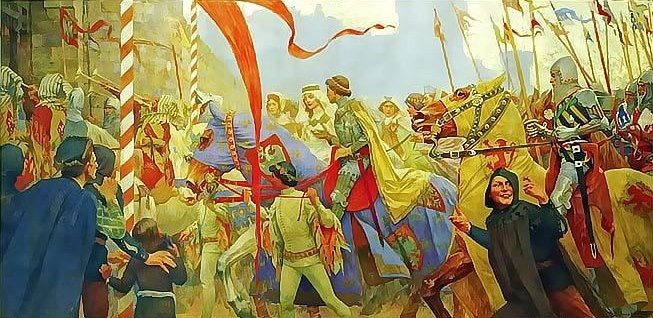 Хм, тук на балканите сме източно-православни, рицари са се подвизавали след превземането на Византийската империя и примера, за който се сещам е сватбата на българската принцеса Мария и латинския император Хенрих. Тя е била пищна и богата, и тук акцента е на празничната атмосфера ( не присъства подсказка за битка или друго историческо събитие ). Стилът на художника е интересен-много живописен, прекалено пъстър за да е средновековен, много светъл и ярък за да е ренесансов и доста сладникав за холандската школа. Наподобява техника с акварел.