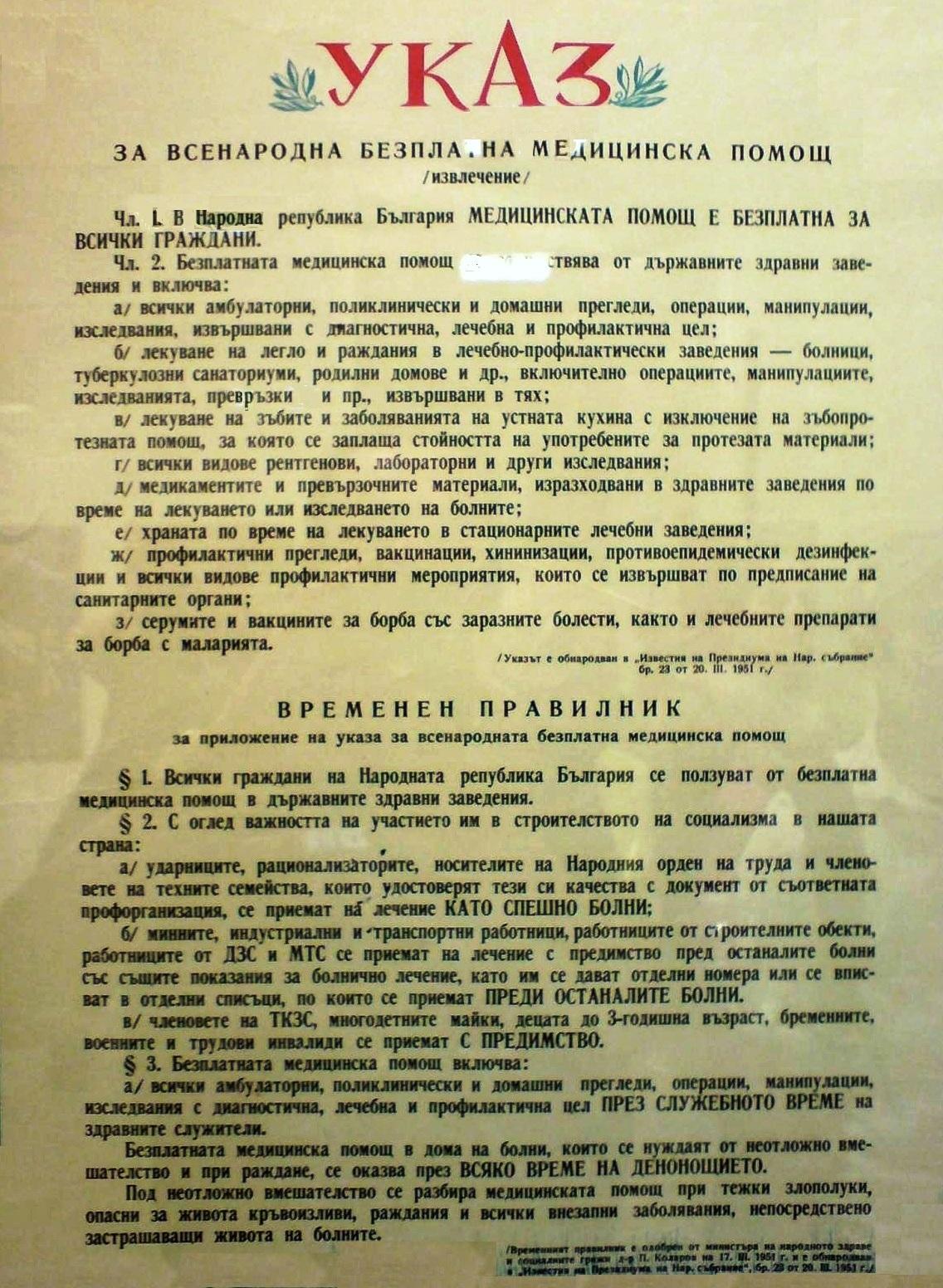 На фона на днешният брой на неосигурените здравно лица, някои от които се лекуват за сметка на платилите здравната си вноска, показвам един документ, който представя закон, който днес сигурно за много звучи абсурдно,нещо като "приказка".