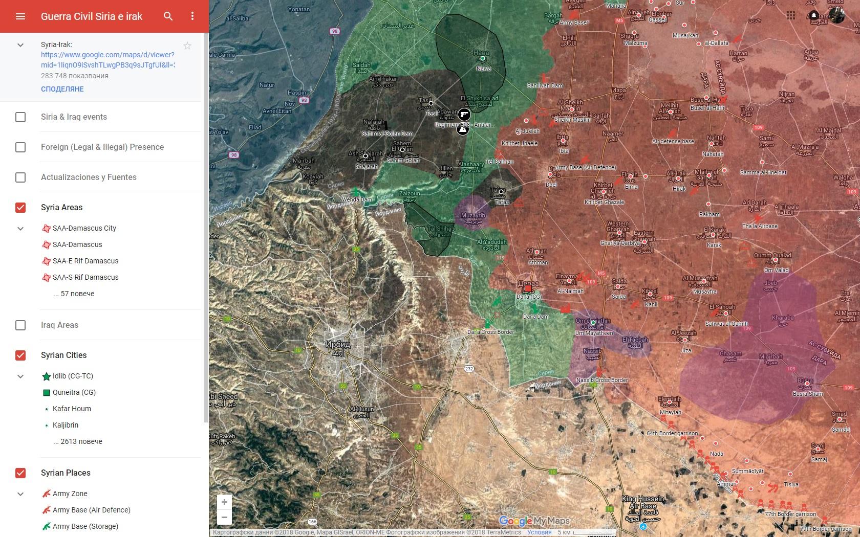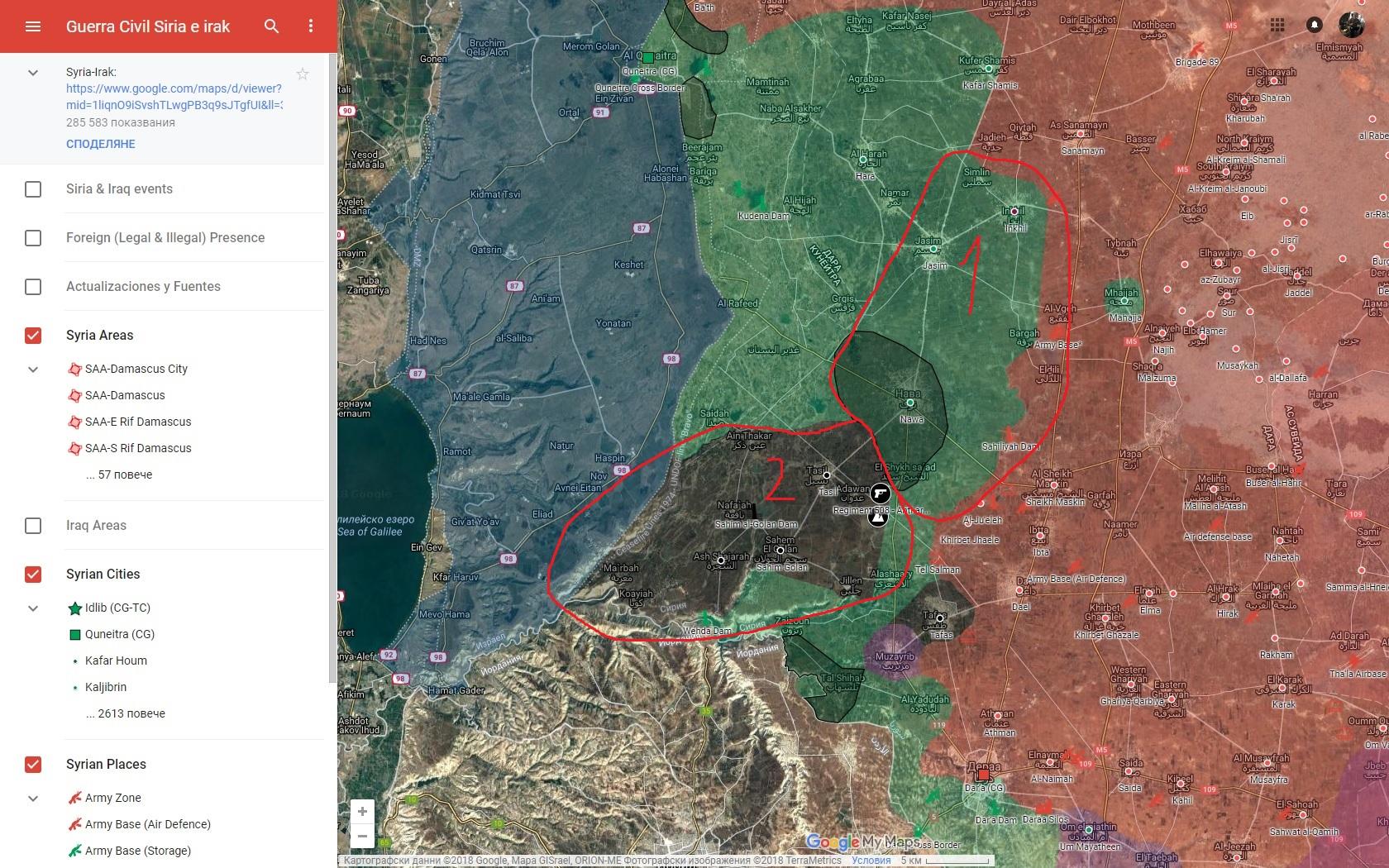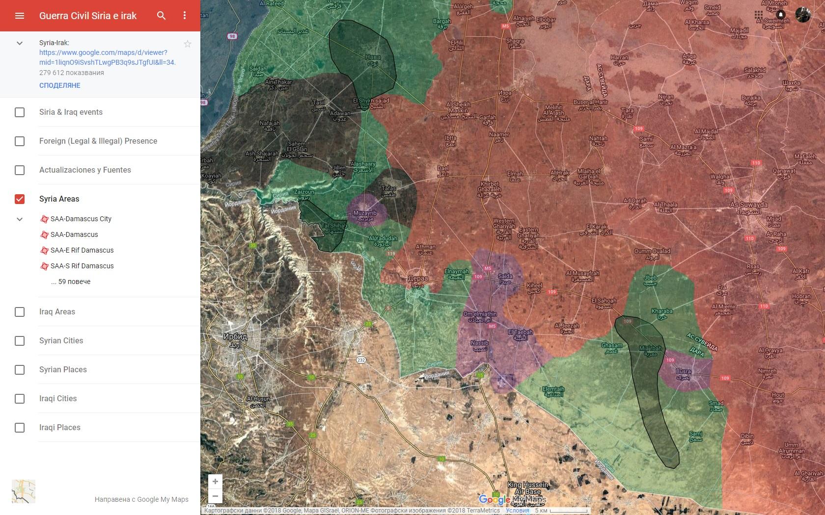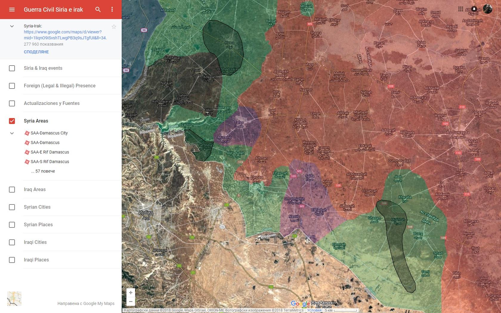 Свежа карта от района. С червено са териториите вече преминали под сирийска власт. С розово са вече капитулиралите градове с които се водят преговори. С зелено са опозиционните райони, а с черно е Халифата.