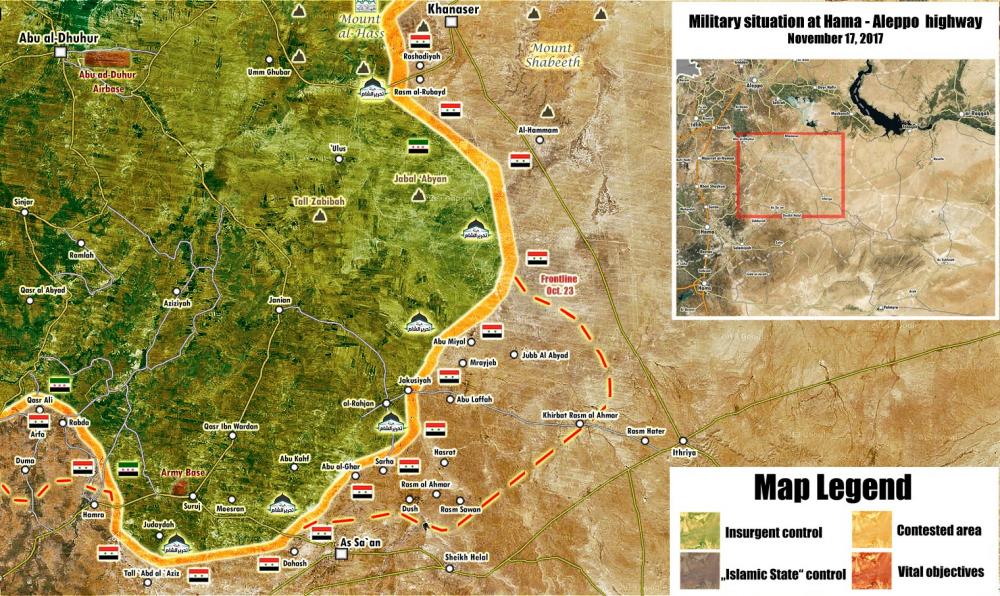 Настъплението в североизточна Хама се развива доста бавно, но успешно. Сирийците продължават да освобождават села изтласквайки терористите далеч от пътя Итрия-Ханасер. Пробив в отбраната не се наблюдава, ХТШ оказва упорита съпротива и когато е възможно контраатакува. Бойните действия едва ли ще се прекратят, тъй като северна Хама е в сирийската зона според договорката между Турция и Русия. Там също е разписано унищожаване на ХТШ и създаване на буферна зона на север и юг в Идлиб.