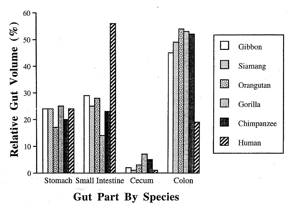 "In addition, the size of the total human GI tract in relation to body size is small in comparison to those of apes."