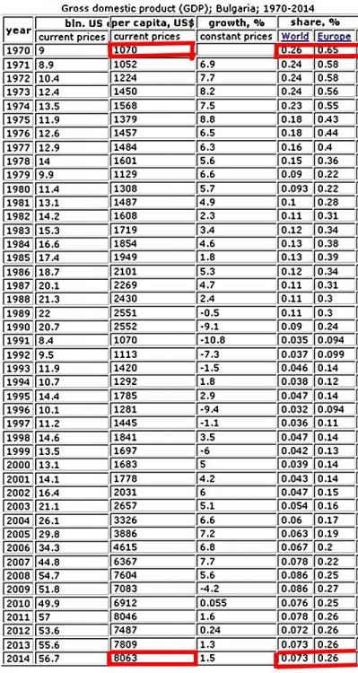 Как стоят цифрите в друг аспект – двете графи вдясно индикират процентния дял на българския БВП в световен и европейски съпоставителен план. Една засечка в началната 1970 и крайната 2014 години показват следната картина: през 1970 г. България е имала 0.25 процента от общото световно производство и 0.65 от общото европейско производство, толкова е била нейната икономическа тежест, съизмерена по двата показателя. През 2014 г. БВП на България тежи 0.073 от БВП на света и 0.26 от БВП на Европа. С други думи – в икономически план България е олекнала 3.5 пъти спрямо теглото на световната икономика (движила се е толкова пъти по-бавно) и около 3 пъти спрямо теглото на европейската икономика.