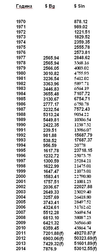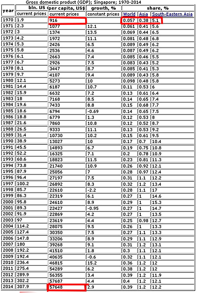 Как изглеждат нещата през този период от 44 години за Сингапур в икономически план от гледна точка нарастването на неговия БВП? Най-повърхностният поглед показва следната картина – Сингапур тръгва през 1970 г. от по-ниска база от България, през тази година БВП на глава от населението е бил 916 ам.долара срещу 1070 ам.долара на човек в България; през 2014 г. Обаче разпределението на БВП на глава от населението в Сингапур е 57648 ам.долара на човек, докато в България те са 8063, тоест разликата е 7 пъти (700 процента) в полза на сингапурската икономика.