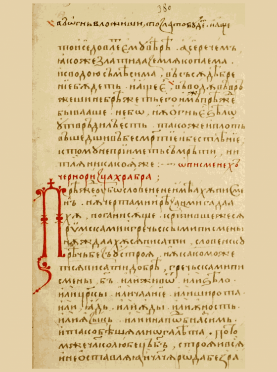 От червените букви нататък започва произведението на Черноризец Храбър. Вижда се, че словене е изписано с Е, а не с Ят.