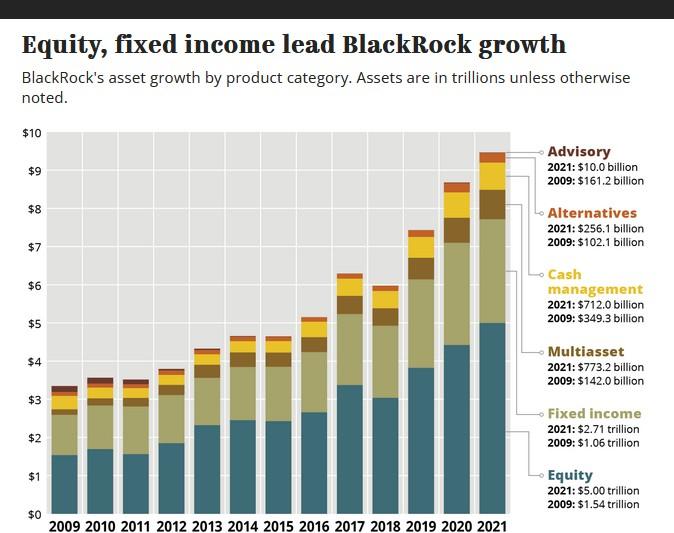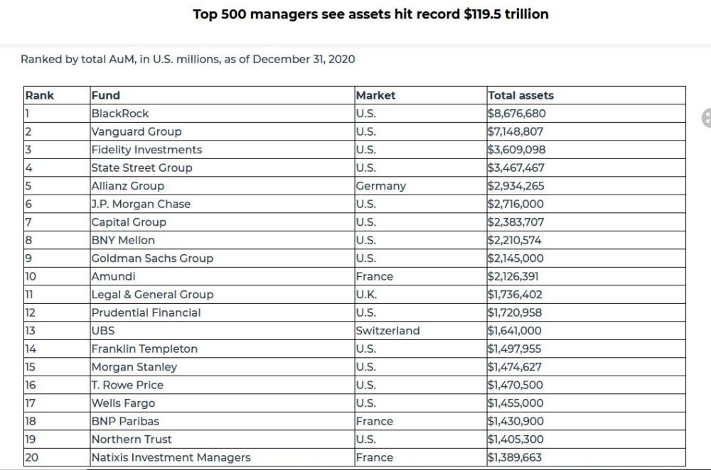 В областта на управлението на активите за инвестиции концентрацията е още по-умопомрачителна, там има няколко Много Големи, които концентрират активи с обем на БВП на Суперсили: