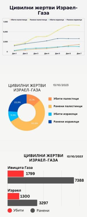 Цивилни жертви между Газа и Израел според официални данни до 13 октомври.