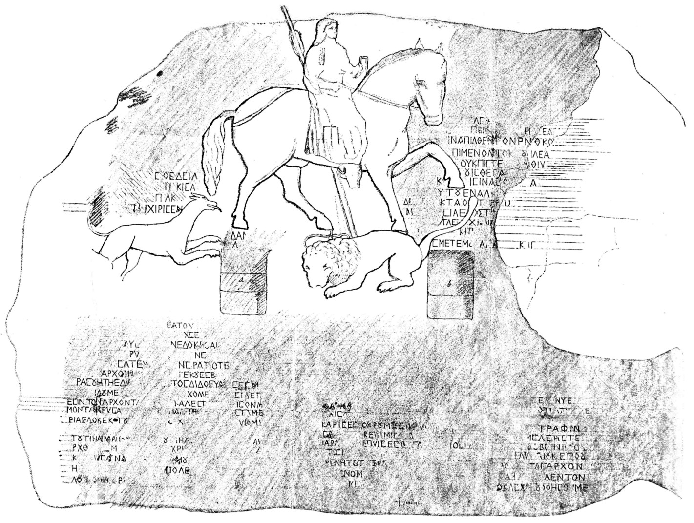Бижу! Отлично се вижда от рисунката, че конят е гледал нас, има стреме, нямало никакво наметало, косите са дълги и свободни на войнат и, че носи дрехи типични повечето на персийците. И всички надписи са преди 781. година, защото са само с големи букви.