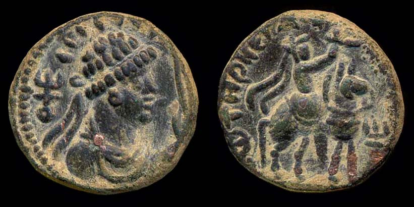 Адшо на кон на бактрийски език(гръцки) от Бактрия,тракийски заселници на Александър владеели всички тези райони.Има стреме.А триста км.на запад да нямат,същите тези тракийци.(нали Филип за гъците също бе варварин,тракиец) .И на едната монета са показани точно такива върви(стреме)където ездача си държи краката.