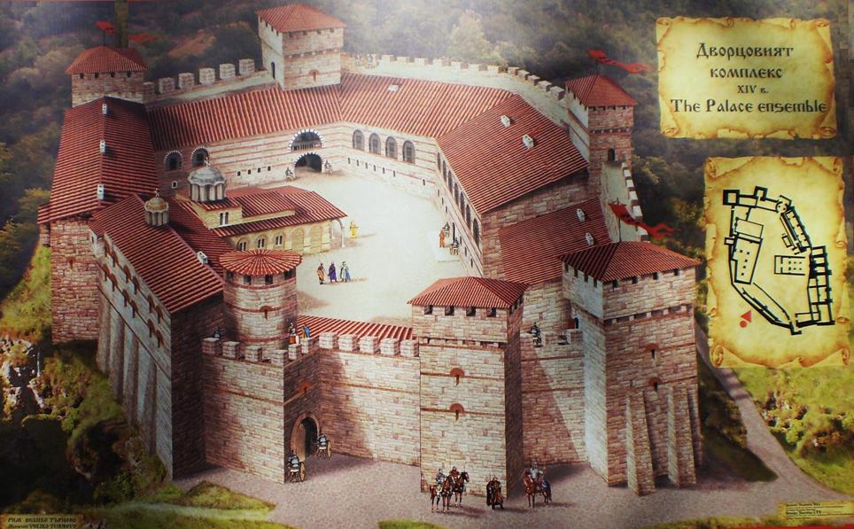 Тези изображения през 2009 г. бяха изложени на табла, поставени до реставрираните останки на Двореца и до новопостроената Патриаршия на Царевец. Не знам с каква техника са правени изображенията. Не знам и кой е авторът им, но предполагам, че едва ли още стоят на Царевец. Пускам ги за информация.